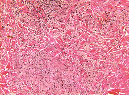图:大面积的坏死。该区域被组织细胞和淋巴细胞的外围边缘以及一些多核巨细胞包围。真皮的相邻区域显示正常的胶原束和成纤维细胞核 (HE 40x).