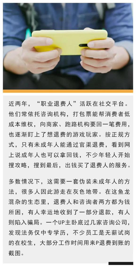 一个16岁的男孩在校园网络的广场上看到有人发退费引流贴,称可以给游戏公司发函、磋商,提高退费比例。男孩凑出400块,但之后,咨询公司只是教他如何在网上按官方步骤申请退费。等了大半年,退回531,和预期差很多。咨询公司一口咬定,这已经是多轮协商的结果。毕老师帮男孩联络游戏公司客服,发现退费申请仅有男孩自己提交的那一次。