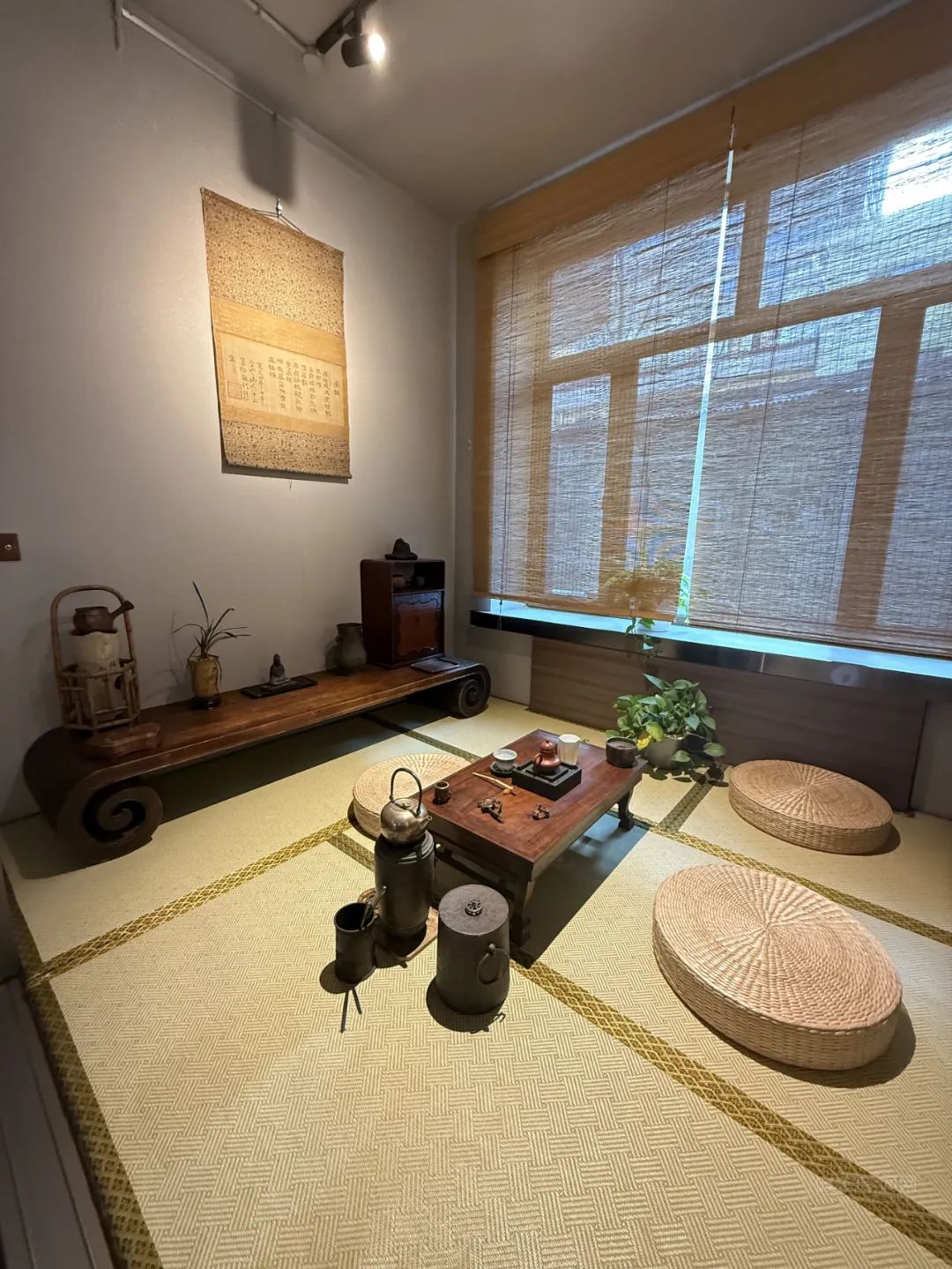 展馆除展示茶具艺术收藏品外,还在二层设置了一处互动体验区。唐宋风格榻座茶席及古琴布设,配以一件件具有年代感的茶具文物,以物入景,以物入画,营造出一隅古风文韵。参观者可更换汉服在此小憩,品茗、弹琴,欣赏馆中藏品意趣。