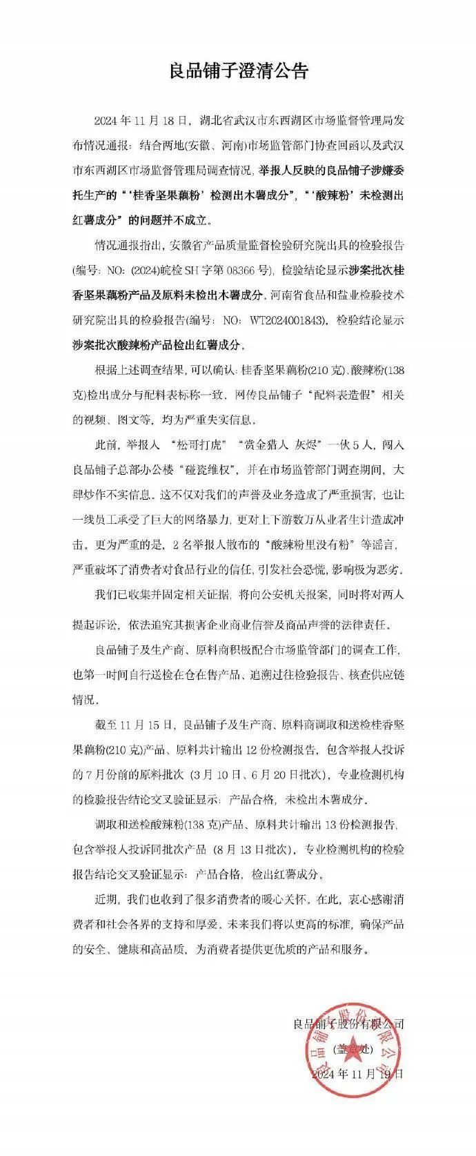 11月19日,良品铺子发布澄清公告称,武汉市东西湖区市场监督管理局通报,结合两地市场监管部门协查回函以及该局调查情况,举报人反映的良品铺子工业公司涉嫌委托生产的“‘桂香坚果藕粉’检测出木薯成分”,“‘酸辣粉’未检测出红薯成分”的问题并不成立。
