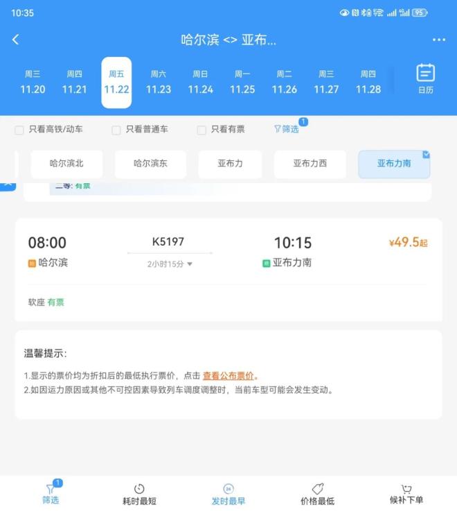 为了确保游客有充足的时间游玩,铁路部门优化了列车运行时刻表,列车采取直达形式运营,8时从哈尔滨站出发,10时15分抵达亚布力南站;返程则在17时25分从亚布力南站出发,19时40分回到哈尔滨站,实现了一日往返。哈尔滨至亚布力南站的K5197次列车提供舒适的软座车厢,定员为390人。目前,旅客已可以在铁路12306网站和App上查询并预订车票。