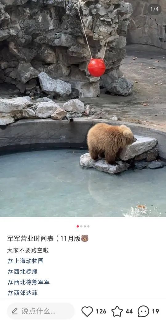 “现代动物园,终极的目标都是更好地保护动物,通过展示等手段,其实也是向人们科普动物们的习性,并让人们懂得如何保护大自然,与动物和谐相处。”在上海动物园,各个展区都会通过各种模拟自然环境的丰容行为来帮助动物们保持原有的自然行为和生态,避免产生刻板行为,而饲养员喂食也会有一套科学的方式,避免动物产生乞食等现象。而游客的喂食,则会造成反效果。“尤其是像‘军军’这样才10个月大的幼年棕熊,正是培养行为习惯的时期,更要注意避免养成乞食行为。”