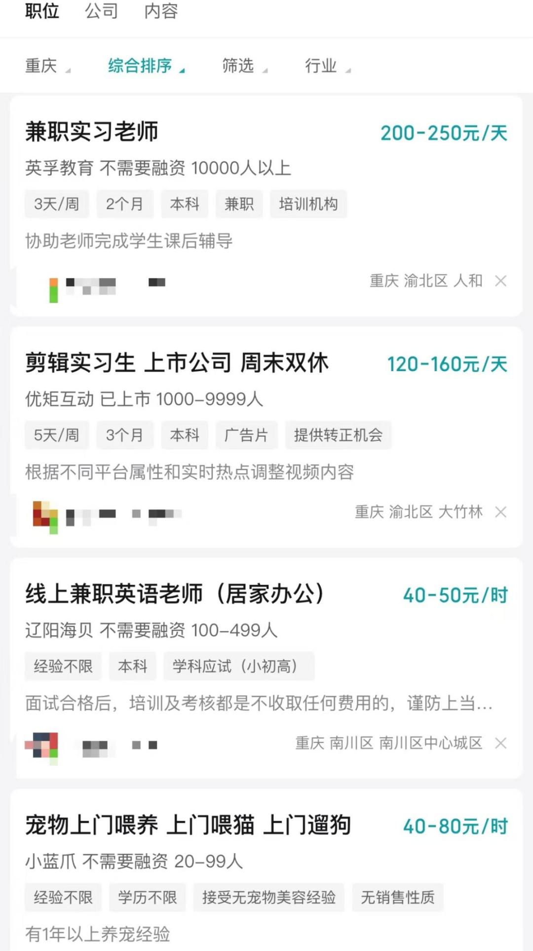 当然,也有线上的:“可以接晚间辅导,一般下午4点到9点或者下午5点到10点,小学每天150~180元,初中每天220元左右,不过这个有一定的接单门槛”“上门喂猫简单,按要拍照拍视频发给宠主就行,每次10分钟左右,一只猫30元,可以两只或以上每只加5元,价格不统一但大差不差,缺点是岗位竞争激烈”“小红书不露脸直播卖货,不需要有经验,17点到22点半、16点到22点、上午8点到16点这几个时段,每次200元”……