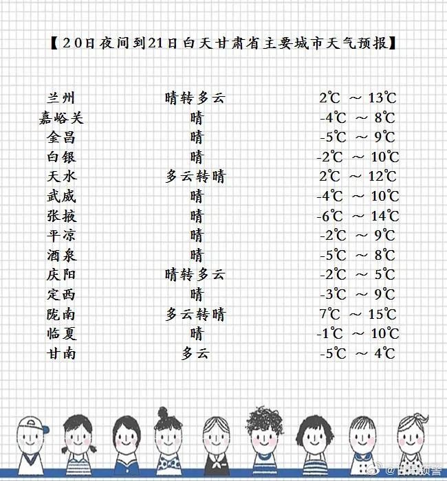 今天夜间到明天白天(11月20日20时-11月21日20时),甘南、陇南两州市多云,局部地方阴有小雪(雨)或雨夹雪;省内其余地方多云或晴。明天夜间到后天白天(11月21日20时-11月22日20时),全省各地晴或多云。