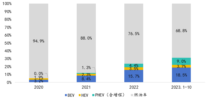 图20 2020-2023.10三线及以下城市按动力类型销量结构