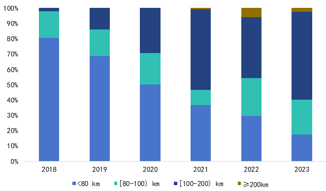 图23 2018-2023年插电式混合动力汽车公告车型纯电续航里程分布