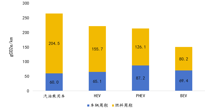 对比常规燃油车,混合动力汽车具备一定的减碳优势。HEV通过发动机和电机协同工作,降低燃油消耗和二氧化碳排放;PHEV(含增程)装备更大容量的电池,生产阶段(车辆周期)碳排放较高,但可纯电行驶,使用阶段(燃料周期)的碳排放更低。综合来看,HEV与PHEV的全生命周期碳排放比常规燃油车低20%[1]。