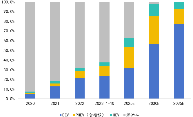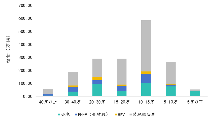 纯电与混合动力汽车在价格区间上形成互补。当前传统燃油车销量结构中10万-20万元的中端车型占比超过一半,纯电产品主要集中于低端市场与高端市场两极,相比之下混合动力车型在中端市场更具优势。2023年1-10月混合动力汽车销量中,10万-20万元中端车型占50%。混合动力路线是全面替代燃油车过程中的关键助力。