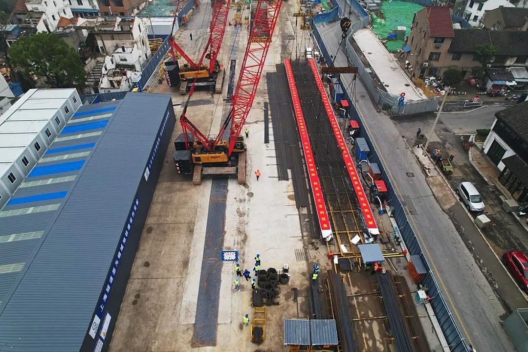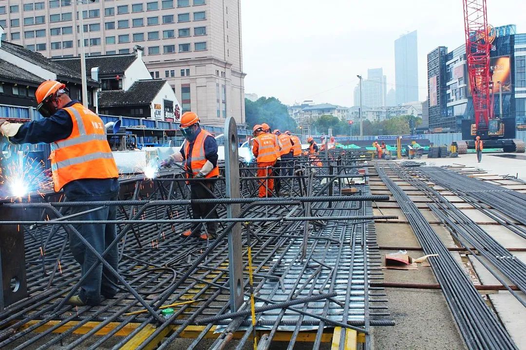 上午9时,永乐东路上车水马龙,围挡内5号线南长街站施工火热。在施工现场,在履带式起重机双机抬吊作业下,钢筋笼被缓缓吊起,精准落位,该站围护结构施工全面展开。一旁钢筋加工区,十几名工人正在焊接钢筋,火星四溅的焊接区与围挡外白墙黛瓦的南长街形成一幅江南风景中的施工画面。