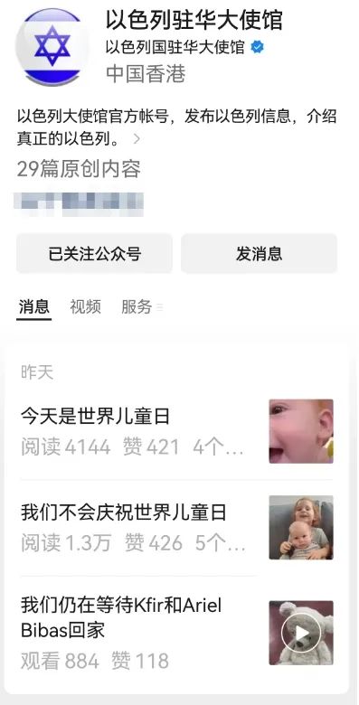昨天是世界儿童日,以色列驻华大使馆官方公众号发布了三个帖子,如下: