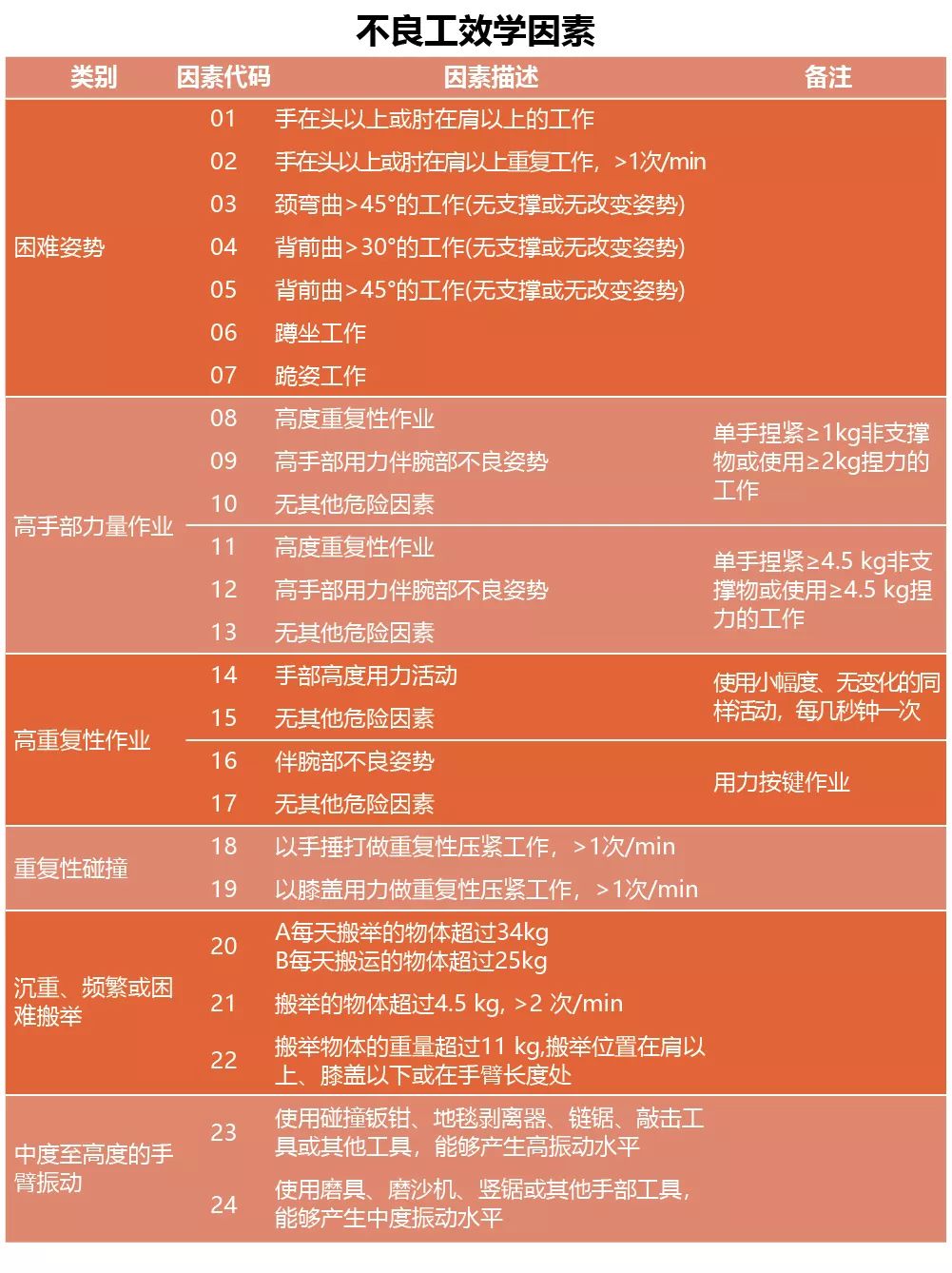 注:不良工效学因素是指那些可导致职业健康病损的不良的人与机器或环境的关系,包括不良姿势、体位、作业方式等。