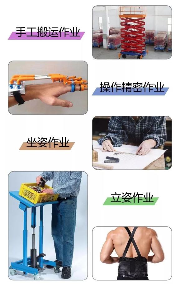 如对手工搬运作业,应配备起重机、升降台、输送带等;对操作精密的作业,应提供手部支撑装置;坐姿作业,工作台的高度应在肘关节高度附近;立姿作业,手的高度应略低于肘关节水平,推荐使用可调节高度的工作台;并为作业人员配备腰椎保护带等。应尽可能使肌肉骨骼减至最低程度,使作业人员可以更加高效、安全和舒适地工作。