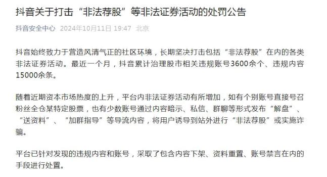 “抖音安全中心”微信公众号10月11日发布《抖音关于打击“非法荐股”等非法证券活动的处罚公告》指出,最近一个月,抖音累计治理股市相关违规账号3600余个、违规内容15000余条。平台已针对发现的违规内容和账号,采取了包含内容下架、资料重置、账号禁言在内的手段进行处置。