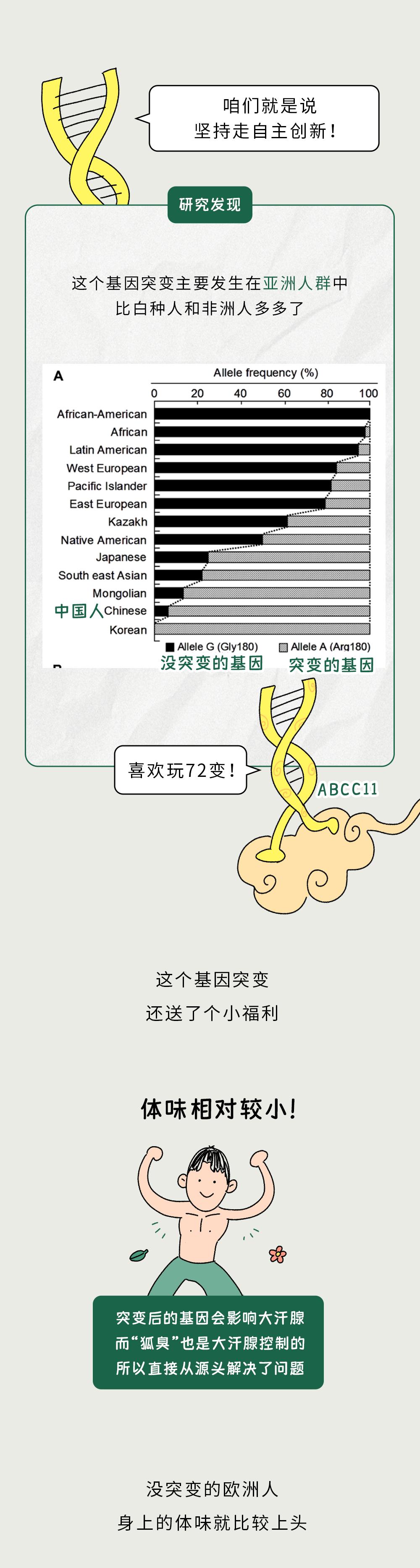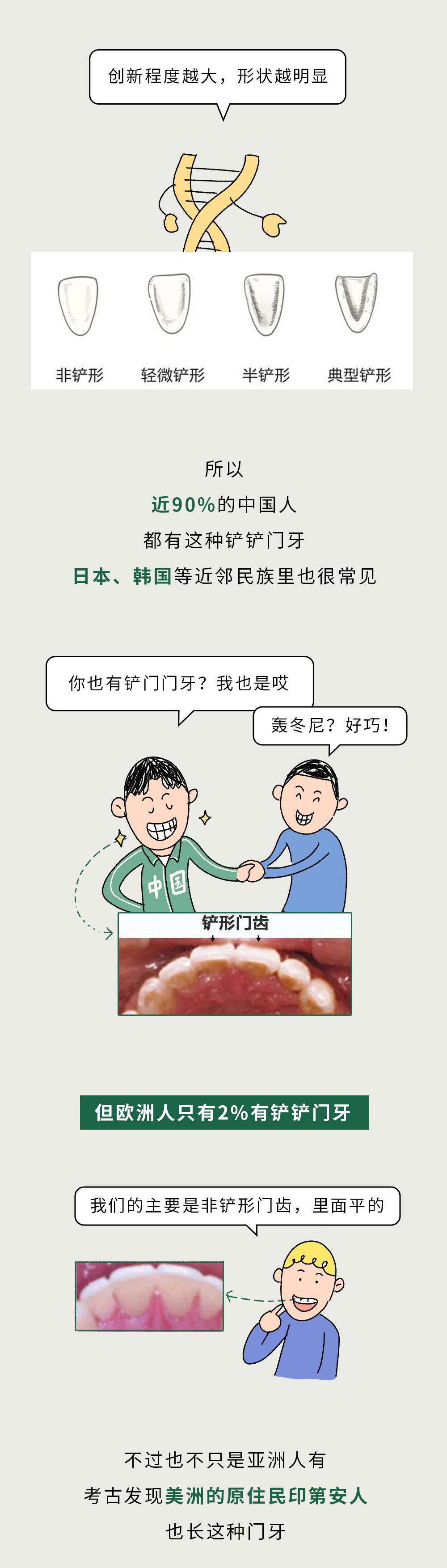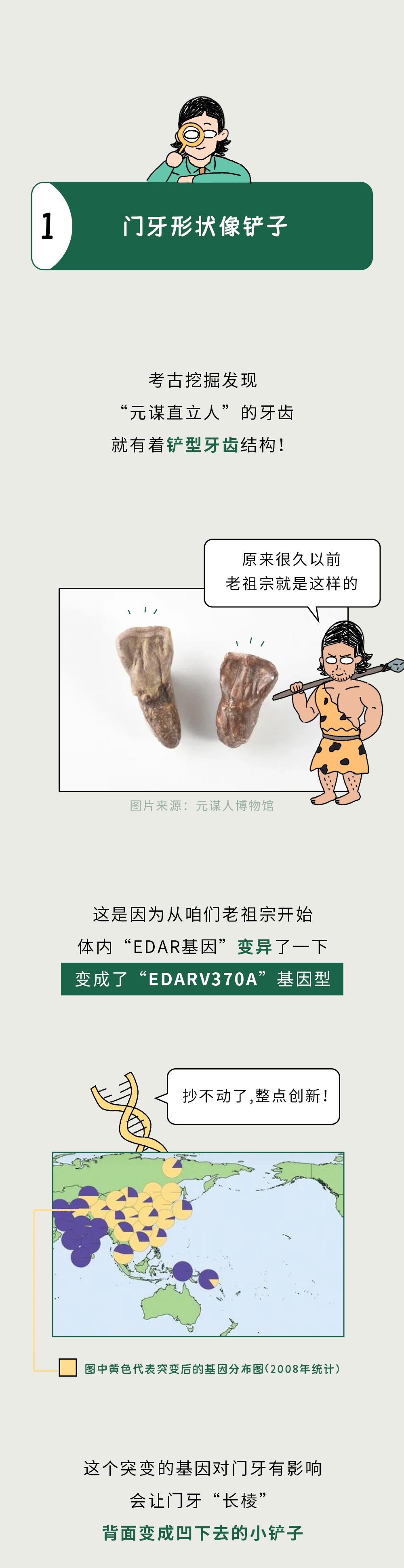 关于中国人的基因为啥会突变,目前还没确切定论。研究推测可能是为了适应东亚的环境而导致基因变化,比如EDARV370A基因变异,除了让你拥有铲形门齿,更突出的是还会让你长粗硬、不易卷曲的头发,所以很多亚洲人都是“黑长直”;让你拥有更多的皮脂腺,有利于保湿润滑皮肤;让你拥有更致密的乳腺组织,能产生富含维生素D的乳汁……于是变异的基因就这么保留下来了。