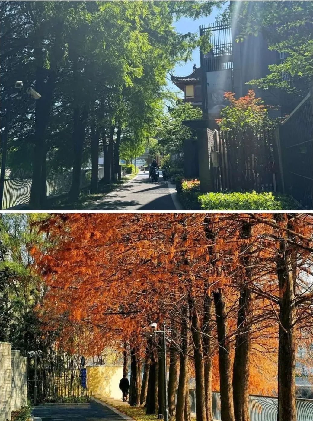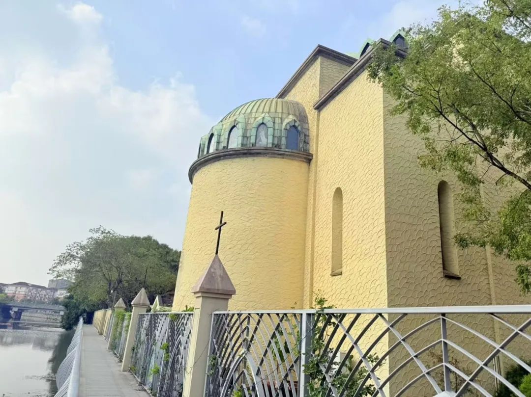 一边欣赏、一边漫步,不知不觉便来到了福缘湾·九华4号楼的所在地,也就是新泾港的西侧。沿岸树木茂密,布满了高大挺拔的水杉,始建于1931年的邬达克建筑息焉堂屹立于此,与古朴的商业建筑相得益彰,充斥着满满的历史文化气息。