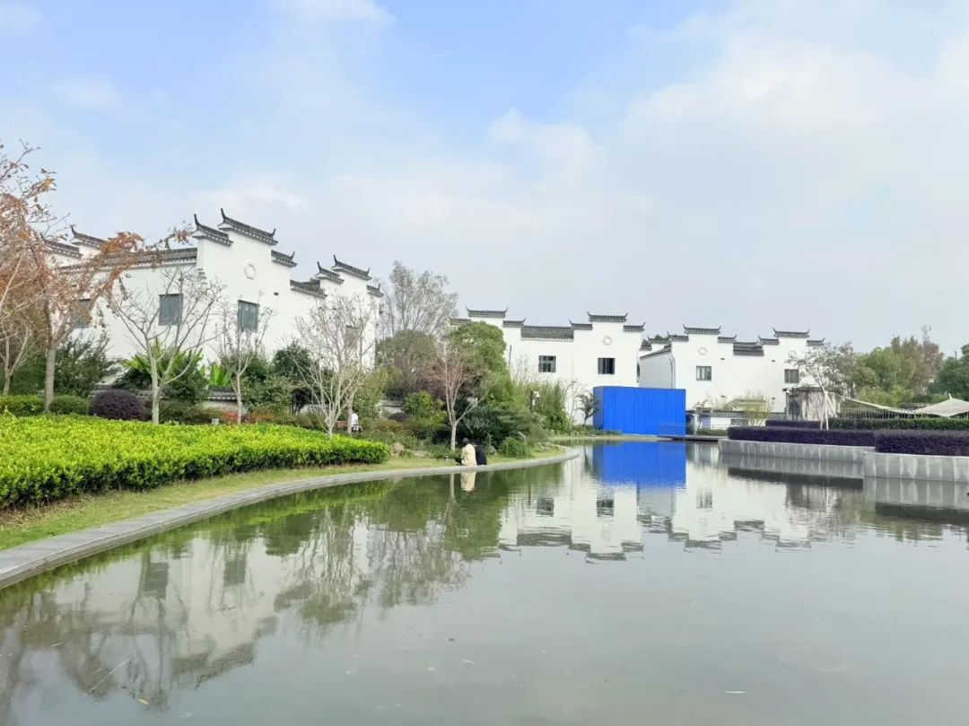 与其隔水相望的则是中新泾公园,白墙黑瓦的徽派建筑倒映在水面上,仿佛是一位婀娜多姿的佳人,静静地伫立在水一方,福缘湾·九华优越的绿色生态环境一览无遗。