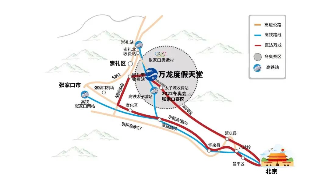 自驾路线可以选择京藏高速或京礼高速,北京到崇礼全程约200公里,车程3小时左右。如果选择京礼高速,可在太子城出口下高速,随后走红花梁隧道,出了隧道2分钟就到万龙啦!