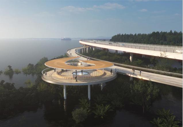 考虑到沿线景观、生态及人文资源丰富,鳌冠大道还将配套建设亲水慢行桥,采用悬挂的形式,蜿蜒绕行于主桥内外间,为市民打造健步赏景的好去处。