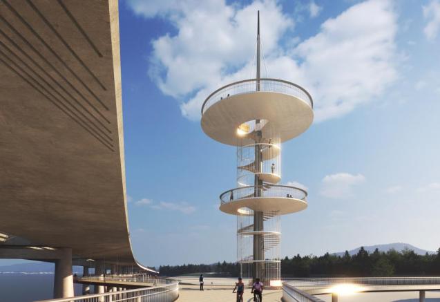 位于整个慢行桥的中间,是整个段落的制高点与地标性建筑。千眺塔不仅作为观景平台,也是慢行桥中部的主要出入口,连接桥与岸边的步行道相连。