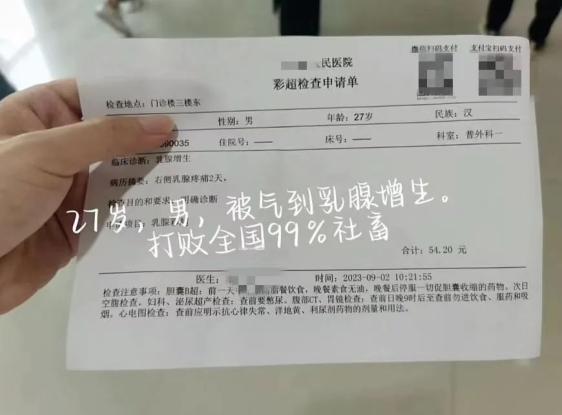 这不,之前我还在社交平台看到过这样的小伙儿,27岁,被确诊为乳腺增生,手持化验单,还打趣自己「打败了全国99%的社畜」。