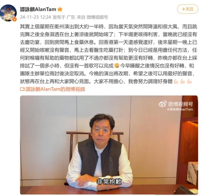 23日中午,谭咏麟在微博发视频表示:“上个星期在衢州演出到大约一半时,因为当天气突然间降温和很大风,而且跳完舞之后全身湿透在台上着凉后就开始咳了;下半场更咳得厉害,当晚就已经没有去庆功宴,回到房间马上食药休息。回香港第一天感觉还好,后来星期一晚上又开始咳嗽没有声音,马上去看医生吃药打针;到今日已经是用尽任何方法,任何对喉咙有帮助的药物都试用了不过亦都没有帮助更没有好转,昨晚亦都在台上彩排试了一个多小时,但没有一首歌可以完成。今早睡醒之后情况也没有好转,和团队主办单位商讨后决定取消。今晚的演出将改期,希望之后可以用最好的声音,状态再在台上再和大家开心见面。大家不用担心,我会努力调理好身体。”
