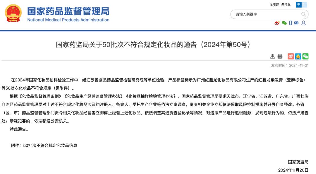 关于50批次不符合规定化妆品的通告