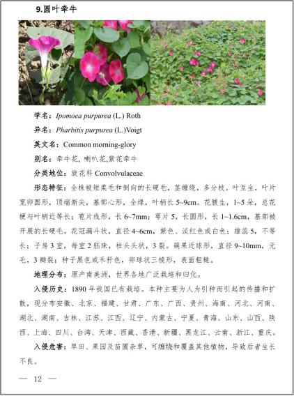 圆叶牵牛原产于南美洲,靠种子繁殖,是全球广泛传播的害草之一,也是我国外来入侵物种中危害较重的植物之一,位列 2014 年公布的第三批外来入侵物种名单中第9位。