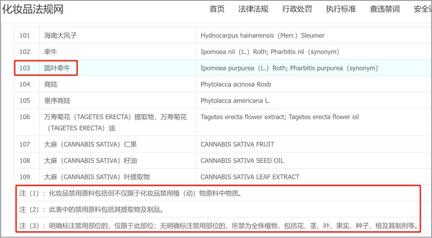 国家药品监督管理局于 2021 年 5 月 26 日发布了《关于更新化妆品禁用原料目录的公告》(2021年第74号)。在该公告中,明确将“圆叶牵牛提取物”列入禁用目录。化妆品中使用的原料需要经过严格的安全性评估。圆叶牵牛提取物可能因存在某些未知的安全风险或潜在的健康危害,而被认为不适合继续用于化妆品中。具体来说,圆叶牵牛提取物中可能含有一些对皮肤有刺激或过敏反应的成分。