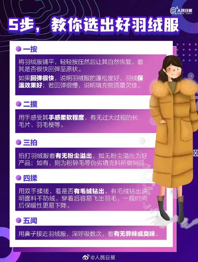 含绒量、充绒量、蓬松度,三大要素决定了羽绒服的保暖性能。现行国家相关标准规定,羽绒服的含绒量最低不能小于50%,含绒量越高羽绒服越保暖。但作为普通消费者,我们无法对商品进行专业检测。有哪些小妙招能够帮助我们挑选到更保暖的羽绒服呢?