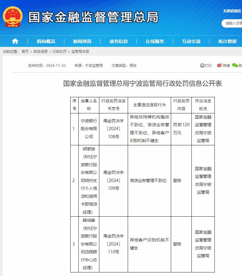 11月22日,国家金融监督管理总局宁波监管局发布的行政处罚信息公开表显示,宁波银行股份有限公司(简称“宁波银行”)被查获“异地非持牌机构整改不到位”、“信贷业务管理不到位”、“异地客户识别机制不健全”的违法违规行为,该行被处以罚款120万元处罚;该行远程银行中心时任总经理薛成峰、明州支行时任个人信贷和信用卡部信贷经理胡家骏分别被处以警告处罚。