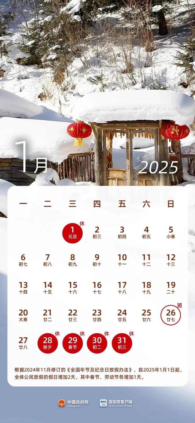 根据2024年11月修订的《全国年节及纪念日放假办法》,自2025年1月1日起,全体公民放假的假日增加2天,其中春节、劳动节各增加1天。据此对放假调休原则作进一步优化完善,除个别特殊情形外,春节自农历除夕起放假调休8天,国庆节自10月1日起放假调休7天,劳动节放假调休5天,元旦、清明节、端午节、中秋节分别放假调休或连休3天(如逢周三则只在当日放假),国庆节放假如逢中秋节则合并放假8天。