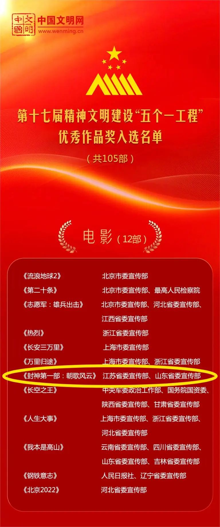继获得第36届中国电影金鸡奖、第37届大众电影百花奖后,由无锡国家数字电影产业园企业立项出品电影《封神第一部:朝歌风云》再入选国家级大奖——第十七届精神文明建设“五个一工程”优秀作品奖,这也是今年江苏省唯一一部电影类作品入选全国“五个一工程”奖。