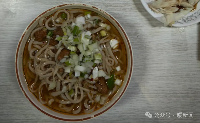 老友说那个擀面师傅就是本店老板,坚持十几年自己擀面开馆,我俩各吃了一大碗刀拔荞麦面。面条筋道细滑、原味留香,关键肉臊子的肉丁大小匀称、肥而不腻,肉臊子的紧致颗粒感和面条的柔韧顺滑结合得天衣无缝。出店回过头看这个铺面,平平淡淡,很不起眼,常会被路人忽略。