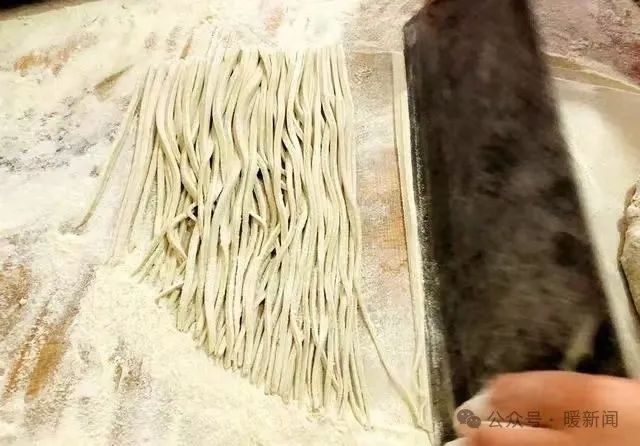 面馆厨房透明玻璃后一个胖乎乎的擀面师傅,掷案有声地擀着面,不一会儿他操起一把两头带把儿的长刀,刀稍比巴掌宽,长度和军刺差不多长,双手用刀下压,先纵向切开面,同时迅速横向拨出一根根面条,如此循环往复,整套动作如行云流水一般。锅盖大的一张面片,顷刻之间支离成无数根面条,像游鱼入海,在开锅水中翻滚。