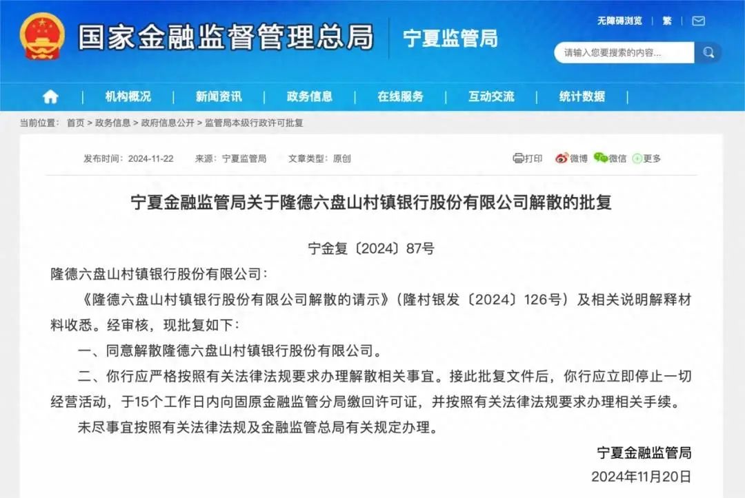 11月22日,金融监管总局官网发布的行政许可信息显示,因被宁夏银行收购,隆德六盘山村镇银行于日前获批解散。