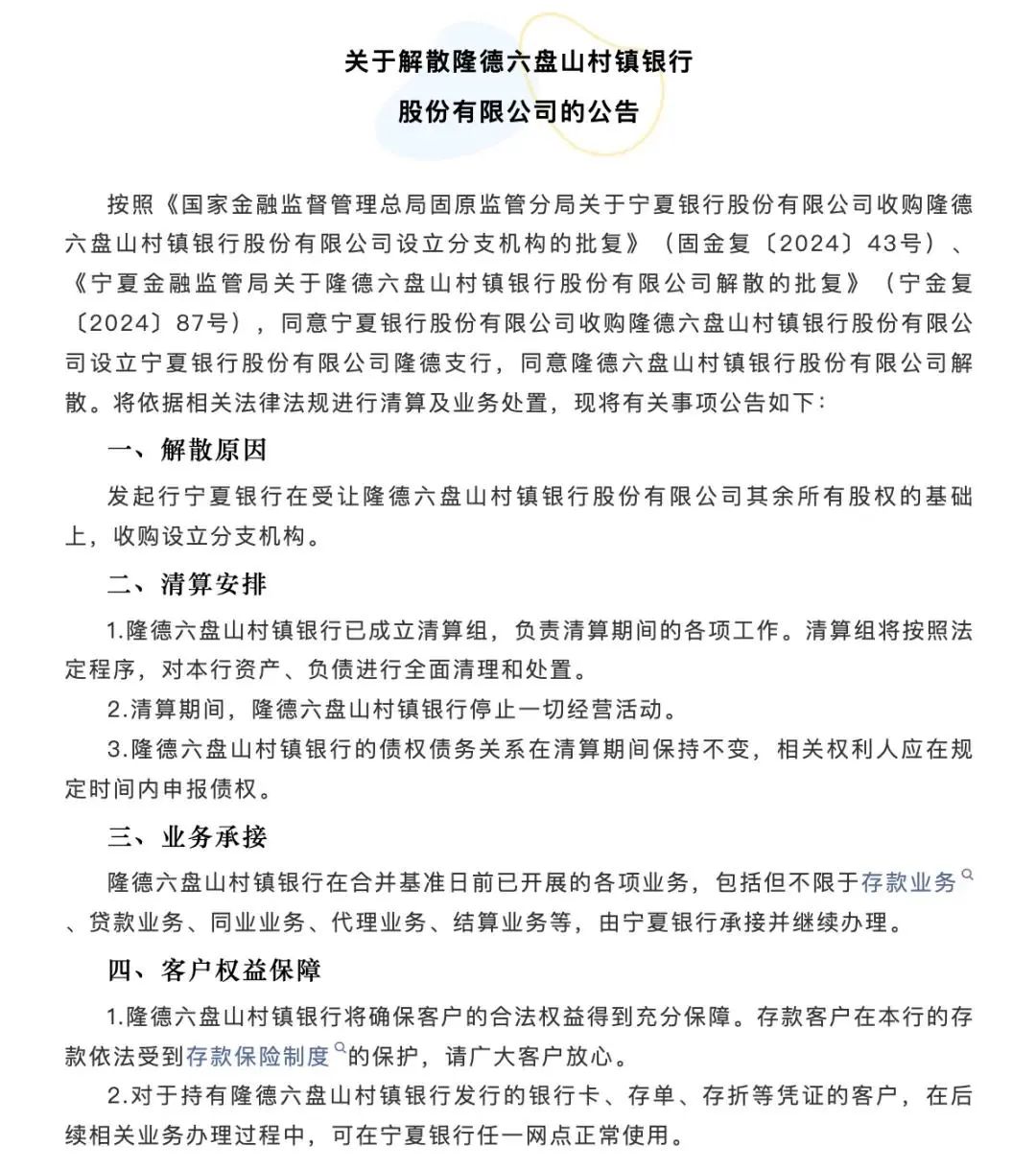 11月21日,隆德六盘山村镇银行清算组发布公告称,隆德六盘山村镇银行在合并基准日前已开展的各项业务,包括但不限于存款业务、贷款业务、同业业务、代理业务、结算业务等,由宁夏银行承接并继续办理。同时,该行将确保客户的合法权益得到充分保障。