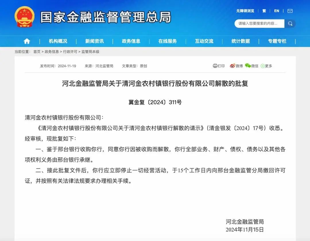 批复文件显示,鉴于邢台银行收购清河金农村镇银行、沙河襄通村镇银行,河北金融监管局于11月15日同意这两家村镇银行因被收购而解散。两家银行的全部业务、财产、债权、债务,以及其他各项权利义务由邢台银行承继。