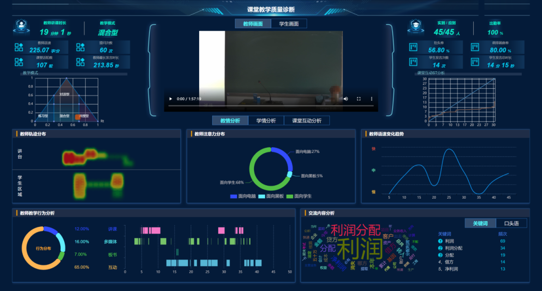 基于课堂教学视频进行AI诊断。不仅包括到课率、前排就坐率、抬头率等基本课堂情况,还包括对课堂教学模式、课堂氛围等情况进行智能分析,并基于过程性学习数据,生成师生的多维度画像,实现师生教学表现的总结性评价,支持不同专业教师之间的教学质量对比,揭示不同专业、不同职称、不同教龄之间的教学差异和共性,促进教学经验交流,帮助教师持续提升教学质量。