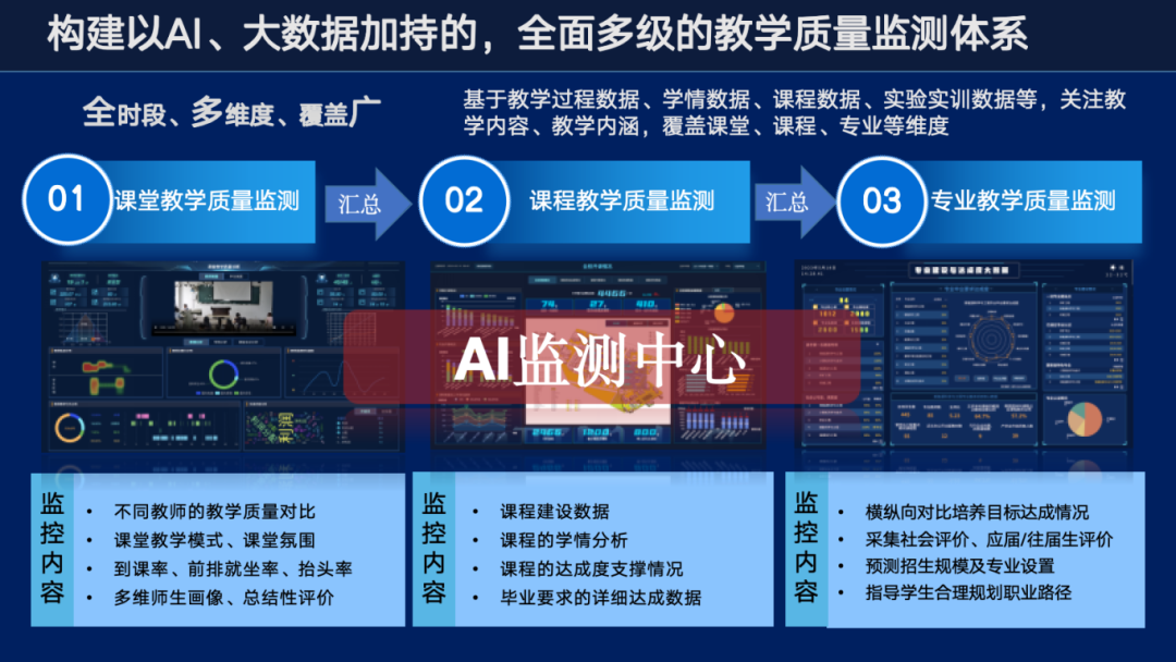 “人工智能赋能教育教学质量评价诊断”案例,针对当前高校教学质量难以准确评估、学生学习效果难以准确掌握的痛点,创新性地将人工智能技术融入于教学质量评估,通过采集、挖掘、分析采集丰富多样的课堂教学状态数据并通过算法进行量化处理,训练出教学质量评价大模型,不仅为教师提供了每门课堂的教学质量诊断,提供课堂教学合理化建议,帮助教师持续改善教学质量;还为教学管理者从课堂教学质量、课程建设质量、专业建设质量、就业质量等方面进行了多维度的数据汇总分析以及决策支持。