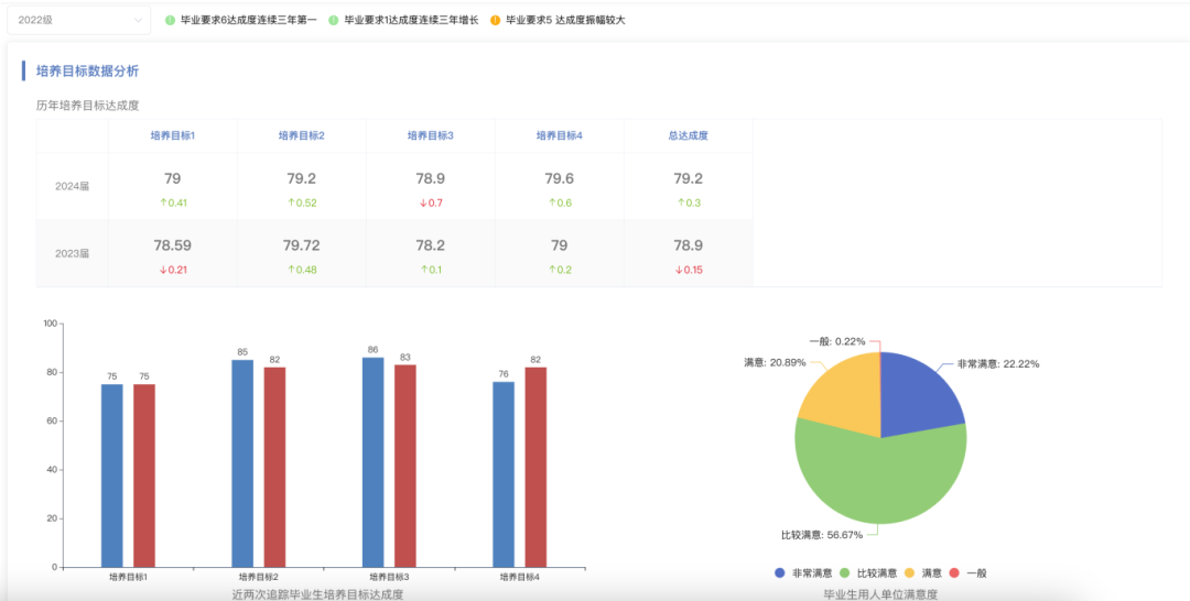 自动分析培养目标的达成情况,通过横纵各项对比,发现潜在问题,提出教育策略调整建议。
