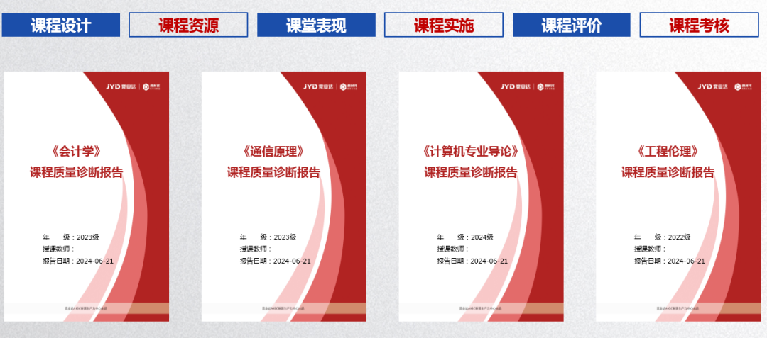 根据所有课堂的教学效果,沉淀出该门课程的建设情况,由AI自动生成学期报告,多年数据积累下来还会形成对比报告,给予课程诊断和改进建议。同时,对于专业下的每门课程,AI自动生成各课程的达成度详细数据,并且测算出专业13项毕业要求的目标达成度支撑情况,确保人才培养目标的全面落实。