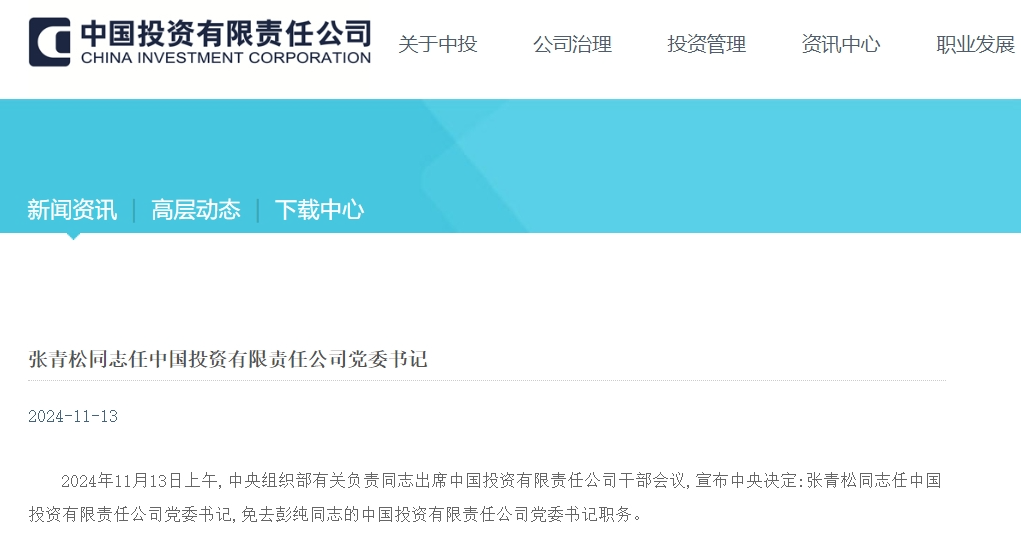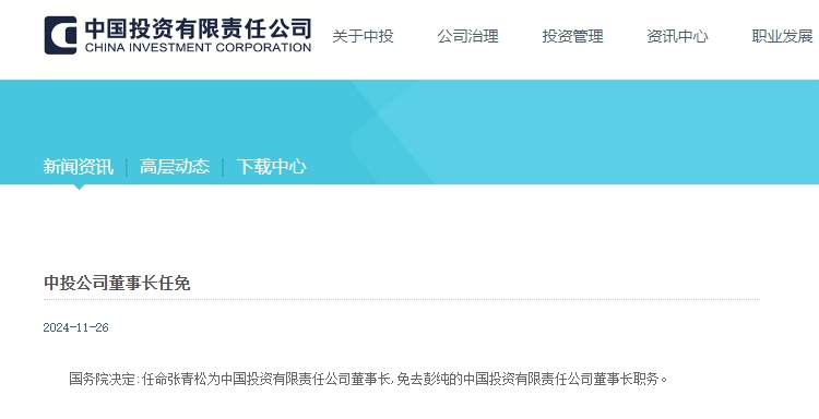 11月26日,中国投资有限责任公司(以下简称“中投公司”)官网发布消息,国务院决定:任命张青松同志为中投公司董事长,免去彭纯的中投公司董事长职务。