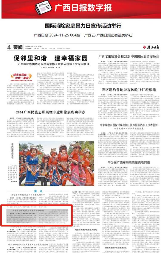 11月24日,由南宁市妇联主办的“反对家暴 让爱回家”2024年“11·25”国际消除家庭暴力日宣传活动在南宁市南湖小区举行。活动受到了社会各界和媒体的广泛关注,一起来看看吧!