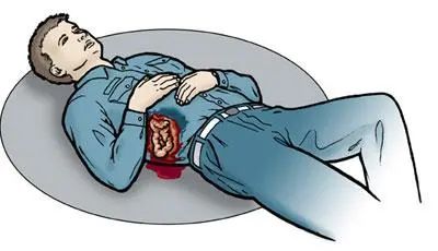 (1)止血。如果是闭合性伤口,应及时压住伤口,进行止血;(2)保鲜。如果是开放性伤口,小肠外露时,应用水打湿上衣,包住小肠,不使其外露于空气中,避免细菌感染,失水干燥坏死。千万不要把沾染污物的内脏回填腹腔,这样会使内脏在腹内相互感染,产生粘连,加速内脏坏死;