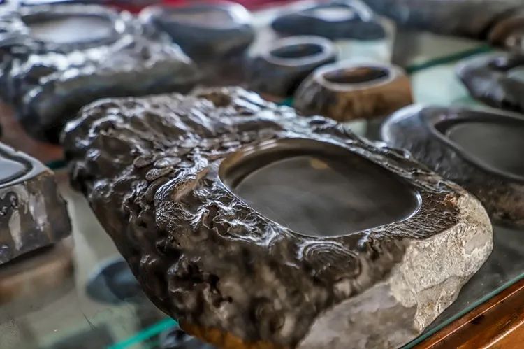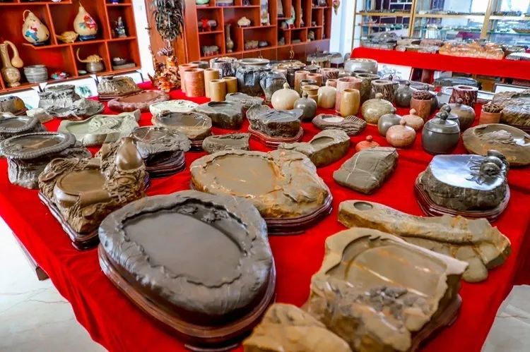 馆中的砚台形色各异、雕琢精美,从花鸟鱼虫到各色植物,以丰富的艺术造型形成了一个个艺术精品。一方砚台,一片匠心。砚台制作已被列为莒县非物质文化遗产。