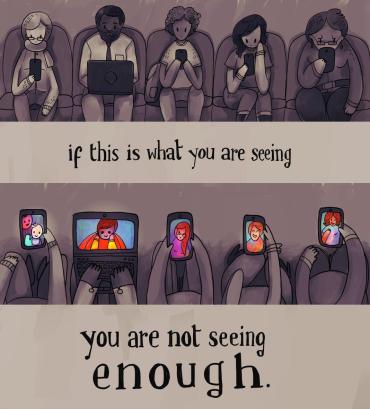 「我们真正‘看见‘的人越来越少,即便我们和别人接触交谈,但没有真正在倾听对方,没有和对方在一起」。就连一个个小家庭里,昔日一家人围坐一起聊天的时间越来越少,取而代之的是一人面前一部手机,沉默着吃完一顿仿佛时空交错的饭。