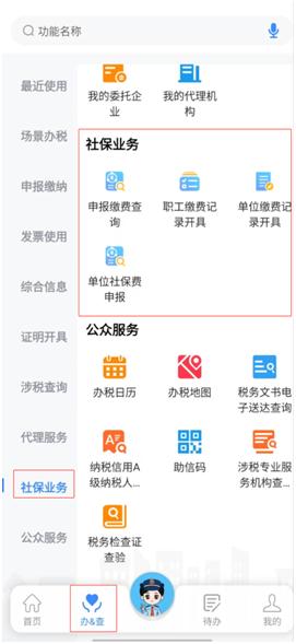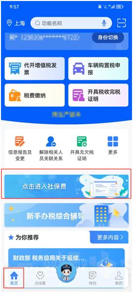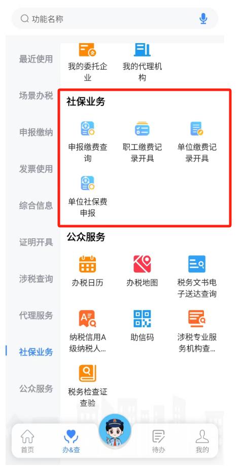 打开电子税务局App,登录后通过【首页】—【点击进入社保费】或点击【办&查】—【社保业务】都可以进入办理社保业务。