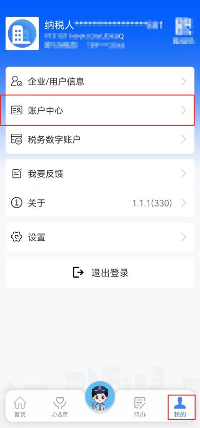 企业法定代表人、财务负责人或管理员登录电子税务局App后,点击【我的】,选择并进入【账户中心】。
