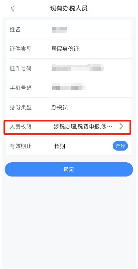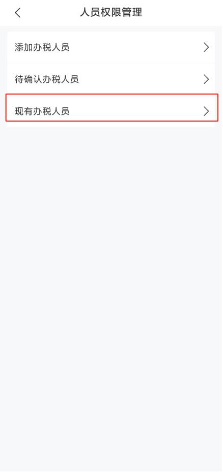 在账户中心中点击【人员权限管理】, 进入【现有办税人员】。