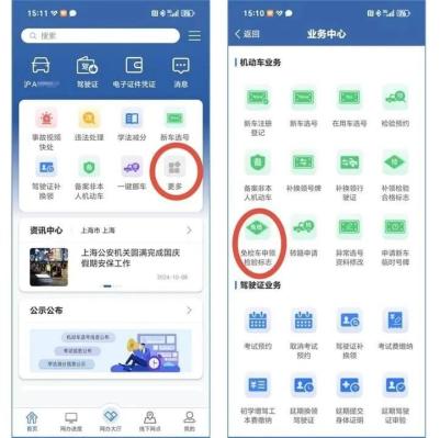 “交管12123”APP线上办理登录“交管12123”APP,在“业务中心”——“机动车业务”版块选择“免检车申领检验标志”,根据页面提示操作即可申领。建议选择申领电子标志(不需要纸质凭证,电子标志与纸质凭证具有同等法律效力),系统将自动受理、审核申请信息并核发电子检验标志。
